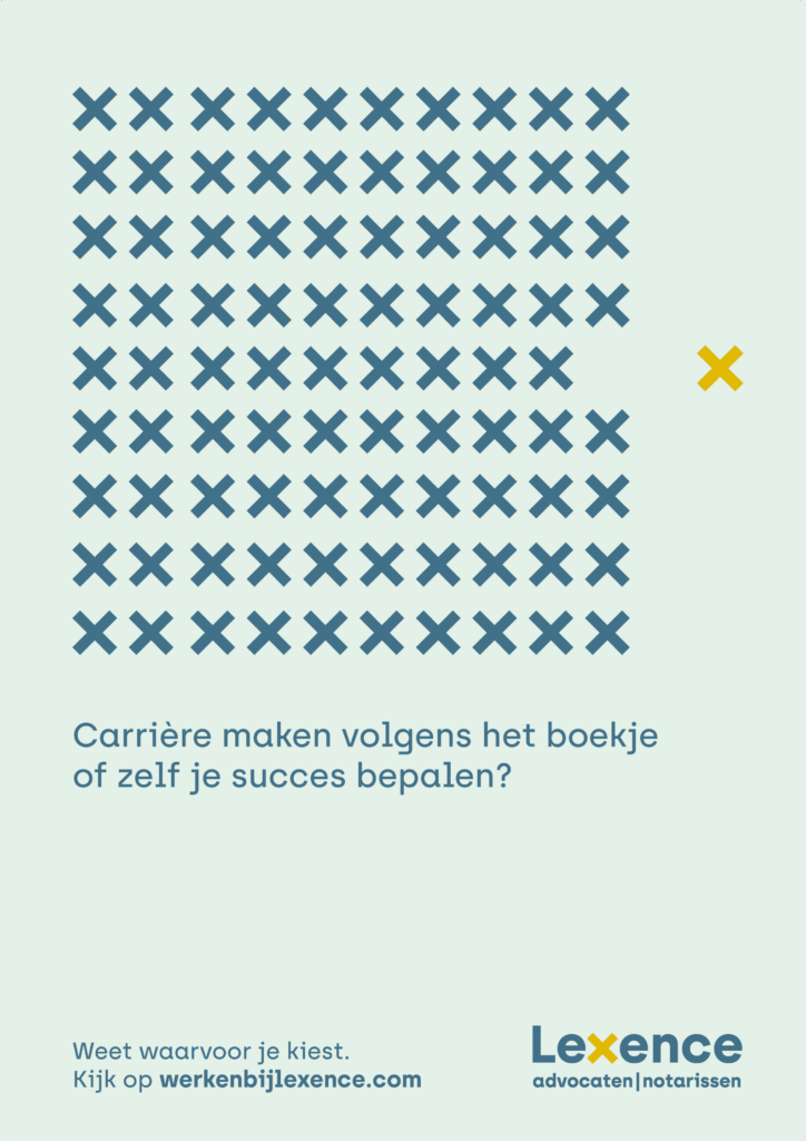 Julie: “De naam Lexence laat nog lang niet altijd een belletje rinkelen. En dat terwijl we een van de grotere kantoren zijn. Onze naamsbekendheid kan duidelijk beter en we hebben daar de afgelopen tijd al verschillende stappen in gezet. Zo bouwt de arbeidscampagne voort op onze nieuwe merkstrategie. Die zet de unieke eigenschappen van ons kantoor scherp neer: persoonlijk en to the point. Met de ‘X’ van Lexence als terugkerend beeldmerk.”