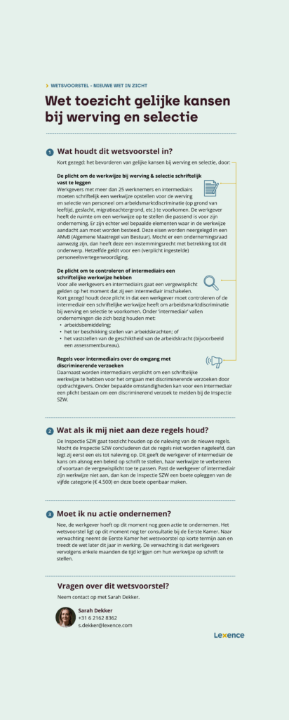 11 mei 2023 – Onlangs is het wetsvoorstel “Wet toezicht gelijke kansen bij werving en selectie” ingediend bij de Eerste Kamer. Sarah Dekker heeft een infosheet opgesteld waarin ze stapsgewijs ingaat op de wijzigingen en impact voor werkgevers.